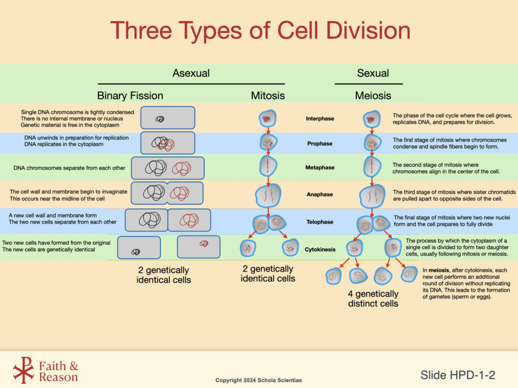 This slide introduces three types of cell division, but in this Investigation, we will focus on binary fission and mitosis. We will return to this slide later when we study meiosis, which is important for reproduction.