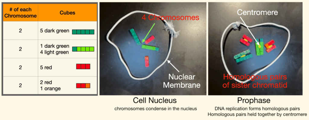 1. Build a model of a body cell with two chromosome pairs in the nucleus. Use the pictures below as a guide. We will use dark green, light green, red, and orange gram cubes in this illustration. You may use different colors but assemble them in the same patterns as shown here.