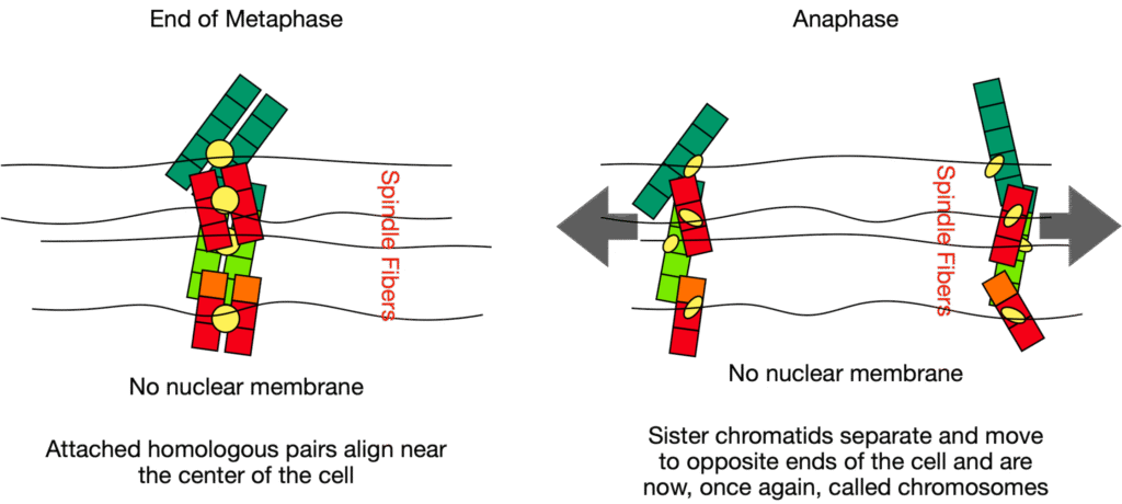 At anaphase, the homologous pairs line up at the middle of the cells begin to separate into sister chromatids, each of which is still associated with the spindle fibers. As anaphase progresses, the sister chromatids are pulled apart and are moved toward opposite ends of the cell.