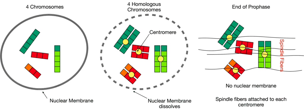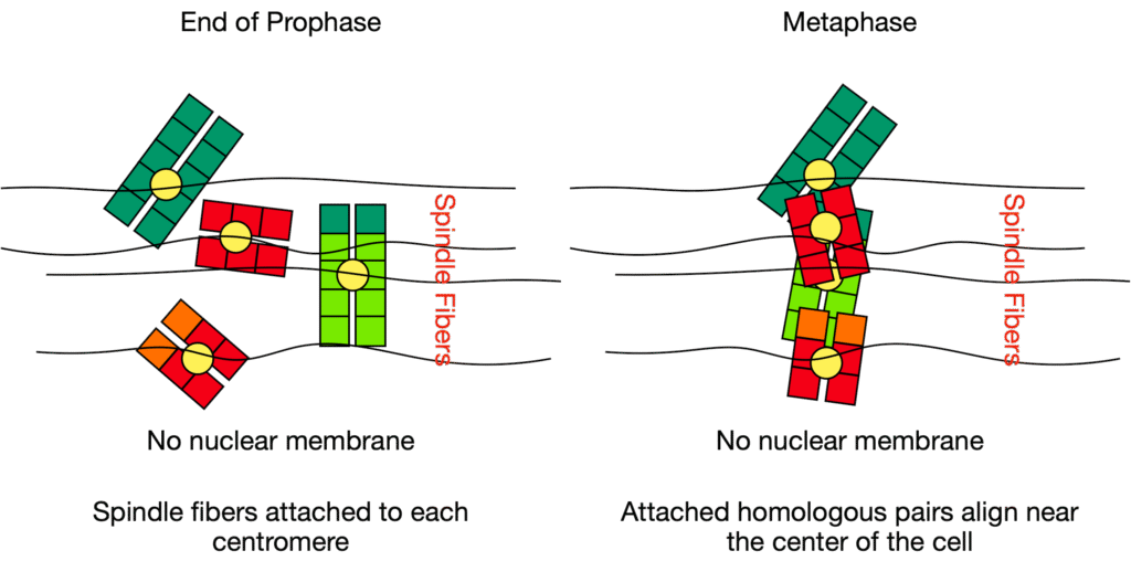 As prophase ends, homologous chromosome pairs form and attach to spindle fibers extending from the cell’s opposite ends. During this process, the nuclear membrane dissolves so the chromosomes can attach to the spindle fibers at their centromeres. At metaphase, the chromosome homologous pairs line up near the center in preparation for the next phase of mitosis.
