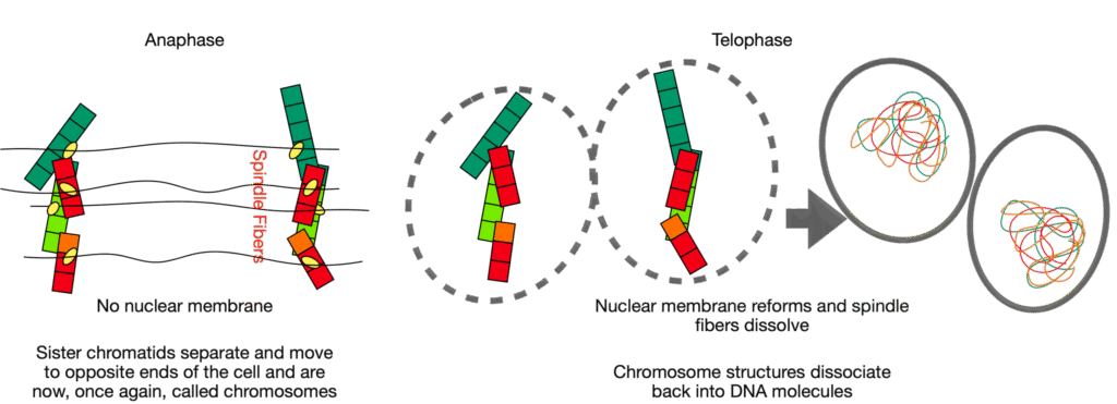 At telophase, the chromosomes have moved to opposite areas of the cell. The spindle fibers dissolve along with the centromers. In addition, the nuclear membrane reforms around the chromosome groups at each end of the cell.