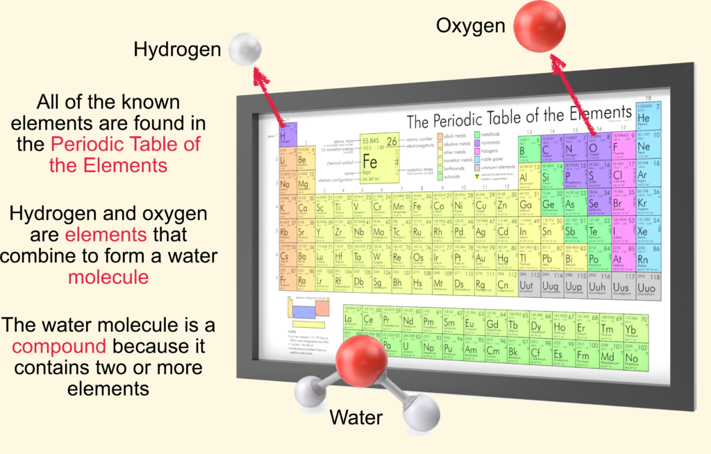 For example, hydrogen and oxygen combine to form water (H₂O).
